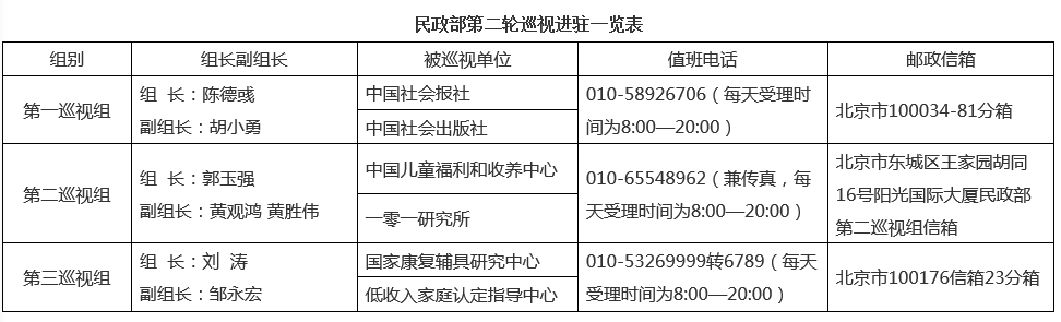 中国社会报社党委副书记秦艳、中国社会出版社党委书记胡晓明、中国儿童福利和收养中心党委书记张世峰、国家康复辅具研究中心党委书记蔡山涛、一零一研究所党委书记袁德、低收入家庭认定指导中心党支部书记陈埙吹,分别代表被巡视单位党组织作表态发言。